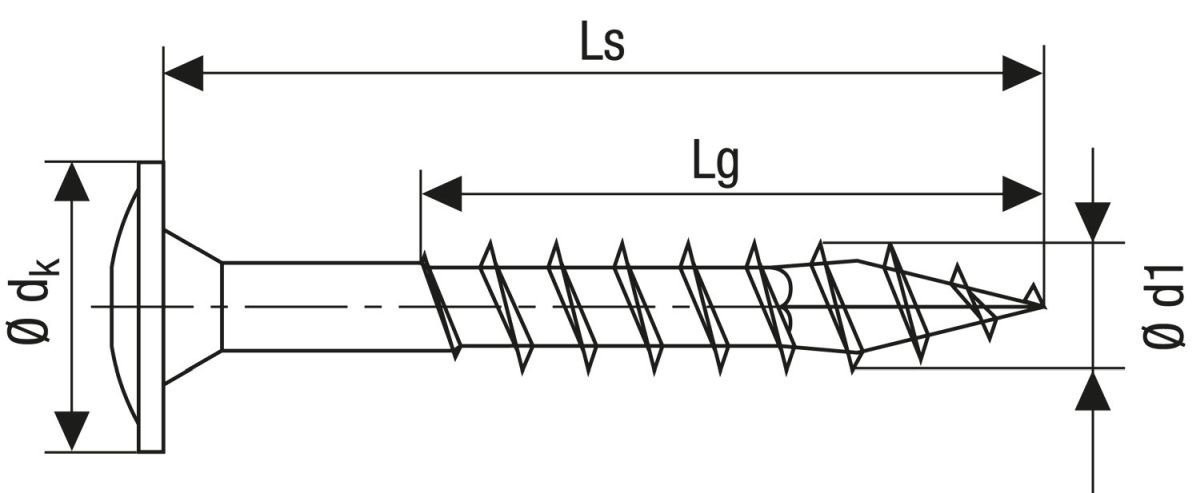 - 4CUT: Ohne Vorbohren (holzabhängig), ihre Spitze verringert wirkungsvoll die Spaltwirkung. Vierkant verdrängt die Fasern des Holzes und reduziert das Einschraubdrehmoment.
