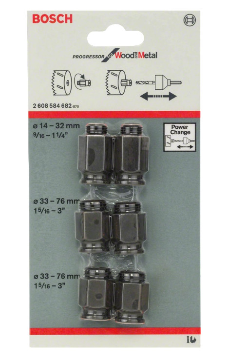 Das Übergangsadapter-Set enthält eine Vielfalt an Adaptern, die die Verwendung von Power-Change-Systemen von Bosch für Lochsägen von Wettbewerbern wie Starrett, Baco und Lenox ermöglichen.