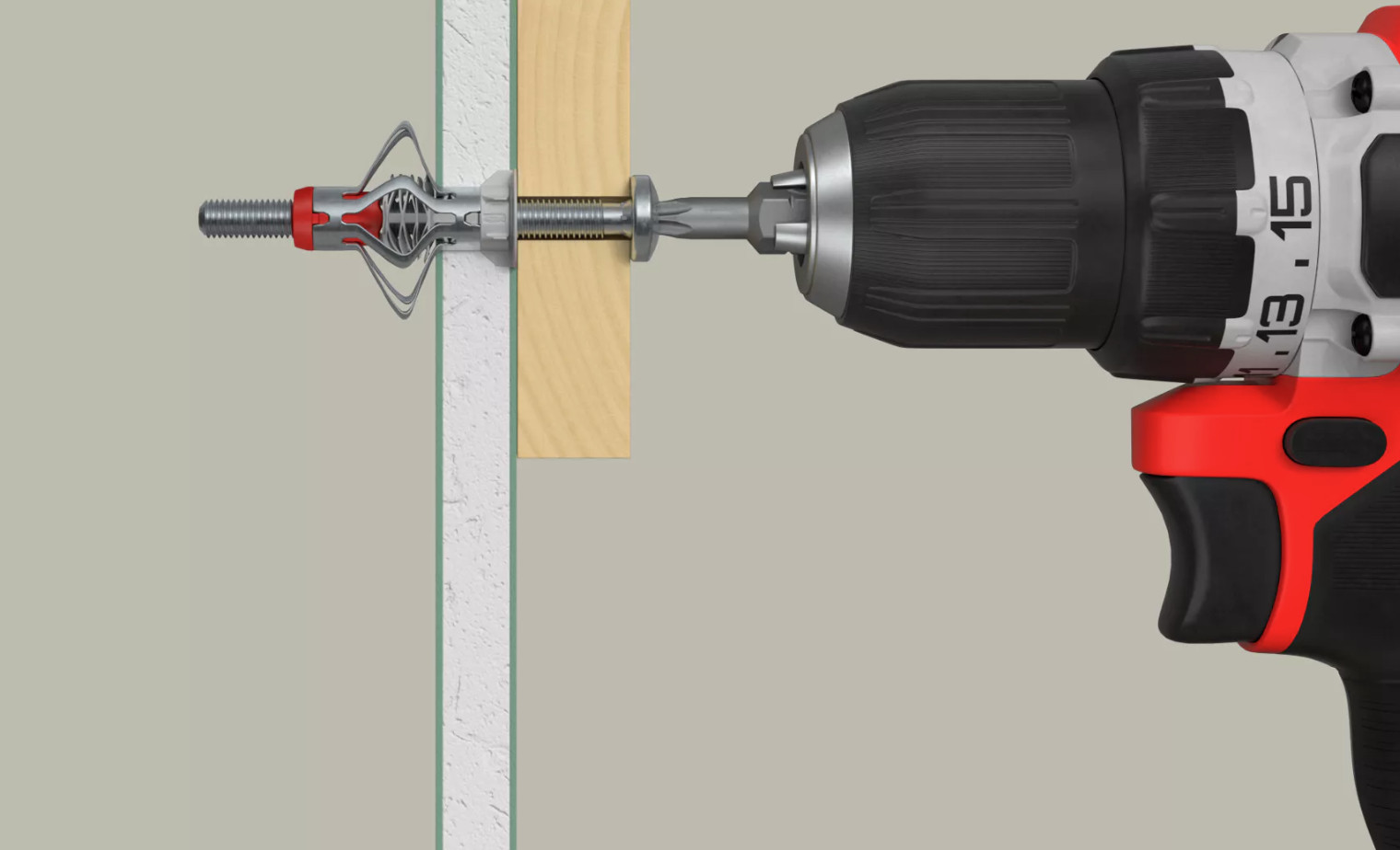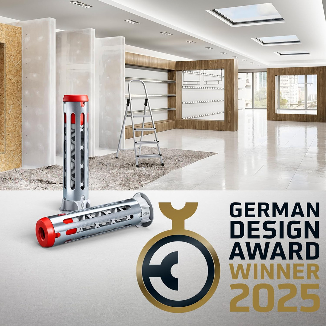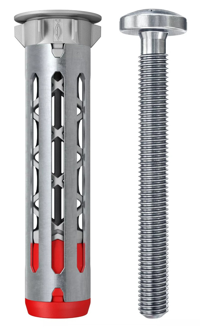 - Die einzigartige 2-Komponenten-Technologie erfüllt hohe Lastanforderungen. Die Metallhülse presst sich an die Plattenrückwand und der Nylon-Grundkörper verspreizt sich im Baustoff.