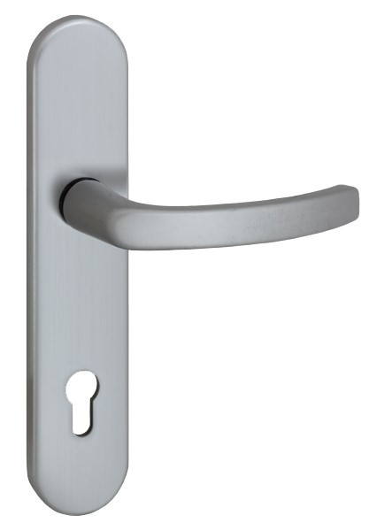 Schutzgarnitur bestehend aus Griff 2200, Außenschild mit Stahlgewinde M6 und gehärteter Stahlunterkonstruktion, Innenschild mit Rückholfeder, beide Schilder abgedeckt mit ovalen Kappen, Verschraubung mit hochfesten Schrauben M6, 8mm Vierkant