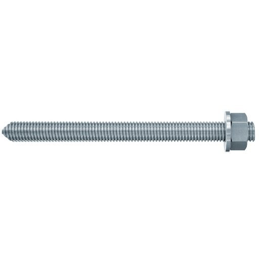 Die fischer Ankerstange RG M wird aus galvanisch verzinktem Stahl der Stahlgüte 5.8 hergestellt. Die Ankerstange ist ein Systemzubehör für die verschiedenen fischer Mörtelpatronen oder Injektionsmörtel. Für Einzelbefestigungen ist die Anwendung mit der vorportionierten Mörtelpatrone besonders wirtschaftlich. Bei der Montage mit der Mörtelpatrone wird die fischer Ankerstange RG M mit einem Bohrhammer drehend-schlagend gesetzt. Beim Setzvorgang wird die Mörtelpatrone zerstört, durchmischt und aktiviert die Mörtelmasse. Bei der Montage mit den Injektionsmörteln wird die Ankerstange von Hand unter leichten Drehbewegungen in das Bohrloch geschoben. Das System ist besonders geeignet für die wirtschaftliche Befestigung von Maschinen, Stahlbaukonstruktionen und Stützfüßen im Innenbereich.
