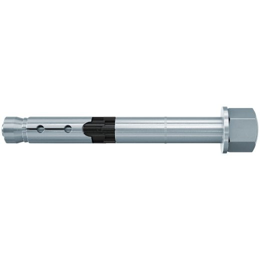 Der fischer Hochleistungsanker FH II H mit Hutmutter ist ein Hülsenanker aus galvanisch verzinktem Stahl. Der Anker wird in der zeitsparenden Durchsteckmontage gesetzt. Beim Anziehen des Ankers wird der Konus in die Spreizhülse gezogen und verspannt diese gegen die Bohrlochwand. Der schwarze Kunststoffring verhindert, dass sich der Anker mitdreht, und nimmt den Anzugsschlupf auf. Das Anbauteil wird dadurch an den Verankerungsgrund gezogen. Der fischer Hochleistungsanker FH II H mit Hutmutter ist bestens geeignet, um in gerissenem und ungerissenem Beton Stahlkonstruktionen, Maschinen und Tore zu befestigen.