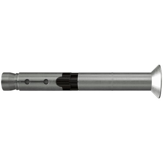 Der fischer Hochleistungsanker FH II SK mit Senkkopf ist ein Hülsenanker aus nicht rostendem Stahl. Der Anker wird in der zeitsparenden Durchsteckmontage gesetzt. Beim Anziehen des Ankers wird der Konus in die Spreizhülse gezogen und verspannt diese gegen die Bohrlochwand. Der schwarze Kunststoffring verhindert, dass sich der Anker mitdreht, und nimmt den Anzugsschlupf auf. Das Anbauteil wird dadurch an den Verankerungsgrund gezogen. Der fischer Hochleistungsanker FH II SK mit Senkkopf ist bestens geeignet, um in gerissenem und ungerissenem Beton Geländer, Treppen und Leitern im Außenbereich zu befestigen.