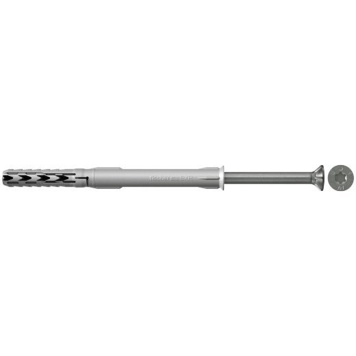 Der fischer Langschaftdübel SXR-T A4 ist ein Dübel aus hochwertigem Nylon mit vormontierter fischer Sicherheitsschraube mit Senkkopf. Dank der besonderen Dübelgeometrie kann der SXR in Vollbaustoffen und Lochbaustoffen eingesetzt werden. Aufgrund der geringen Verankerungstiefe von nur 50 mm lässt sich der Langschaftdübel vor allem bei Mehrfachbefestigungen von nicht tragenden Systemen besonders wirtschaftlich verarbeiten. Der fischer Langschaftdübel SXR-T A4 ist mit der Senkkopfschraube besonders für die Befestigung von Holzkonstruktionen zu empfehlen.