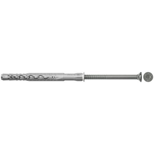 Der fischer Langschaftdübel SXRL-T A4 ist mit der fischer Senkkopfschraube mit TX40-Antrieb für Mehrfachbefestigungen von nicht tragenden Systemen in Mauerwerk, Beton und Porenbeton zugelassen. In Lochsteinmauerwerk leiten die zwei Spreizzonen des Dübels gleichmäßig Kraft ein, in Porenbeton und Vollbaustoff vereinen sich diese zu einem langen Spreizelement. Mit der Sicherheitsschraube aus nicht rostendem Stahl ist der Langschaftdübel für Befestigungen im Außenbereich wie Fassaden-, Decken- und Dachunterkonstruktionen geeignet.