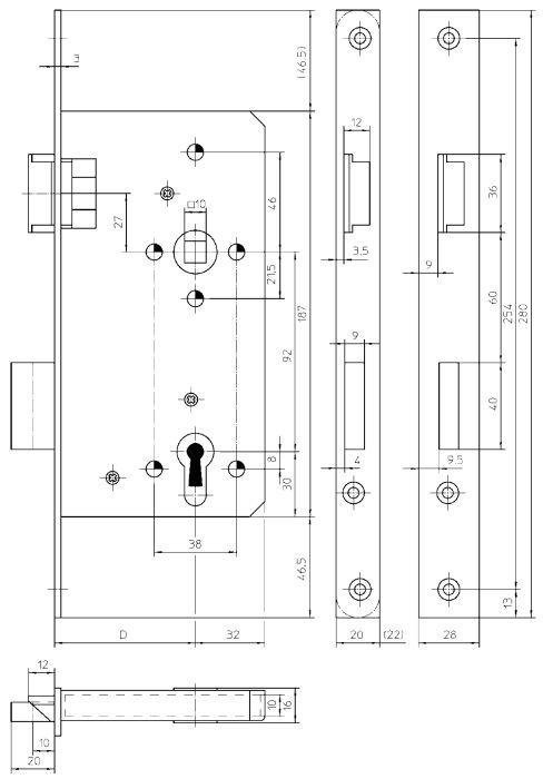 Für stumpfe Haustüren, mittelschwere Ausführung, Falle und Riegel aus Zink-Druckguss, Klemmnuss 10 mm, Entfernung 92 mm, Stulpmaß 28 x 280 mm, ohne Schließblech.