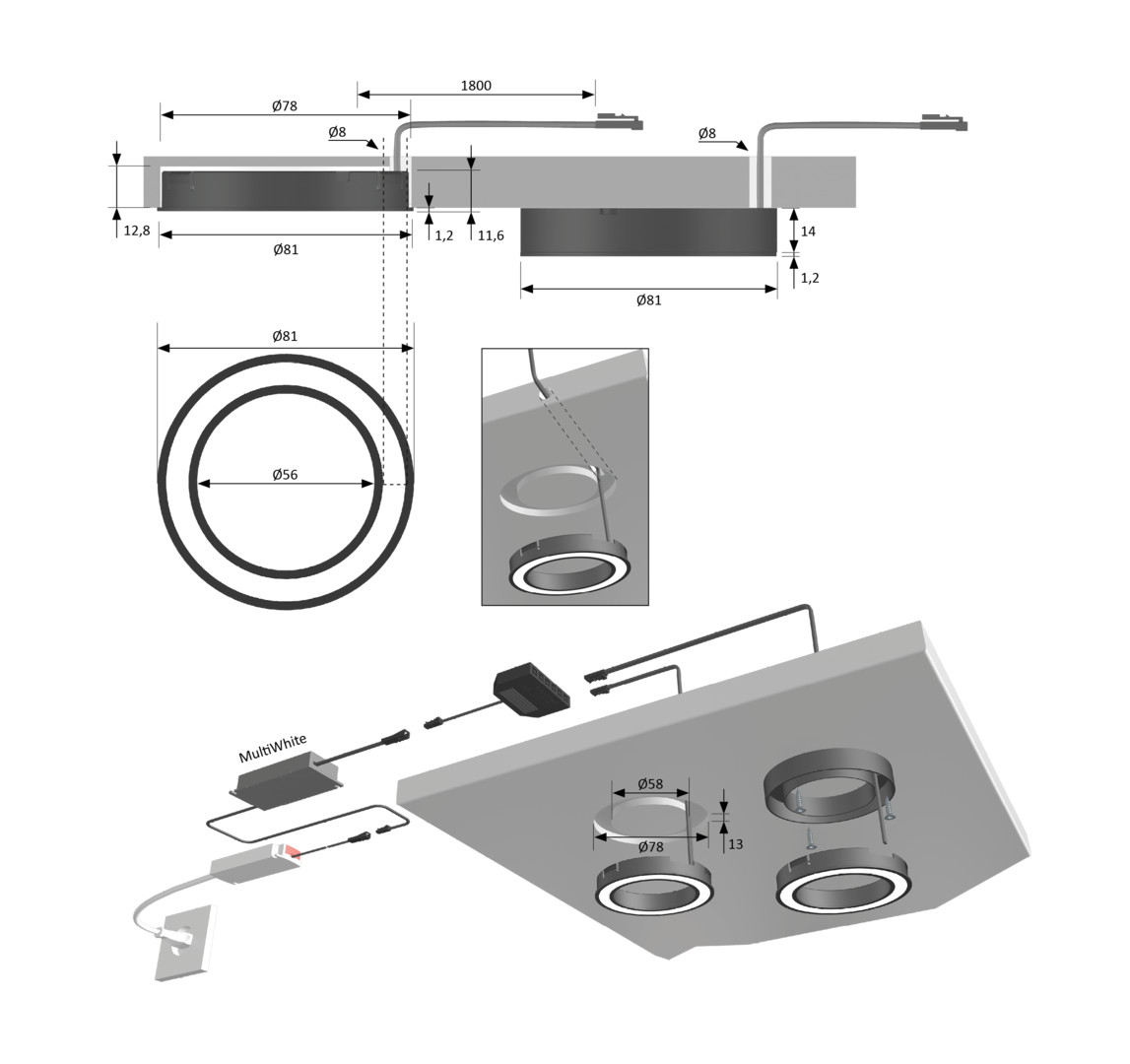 - Einbauleuchte für 78 mm Einbaudurchmesser, Nutbreite 9,5 mm