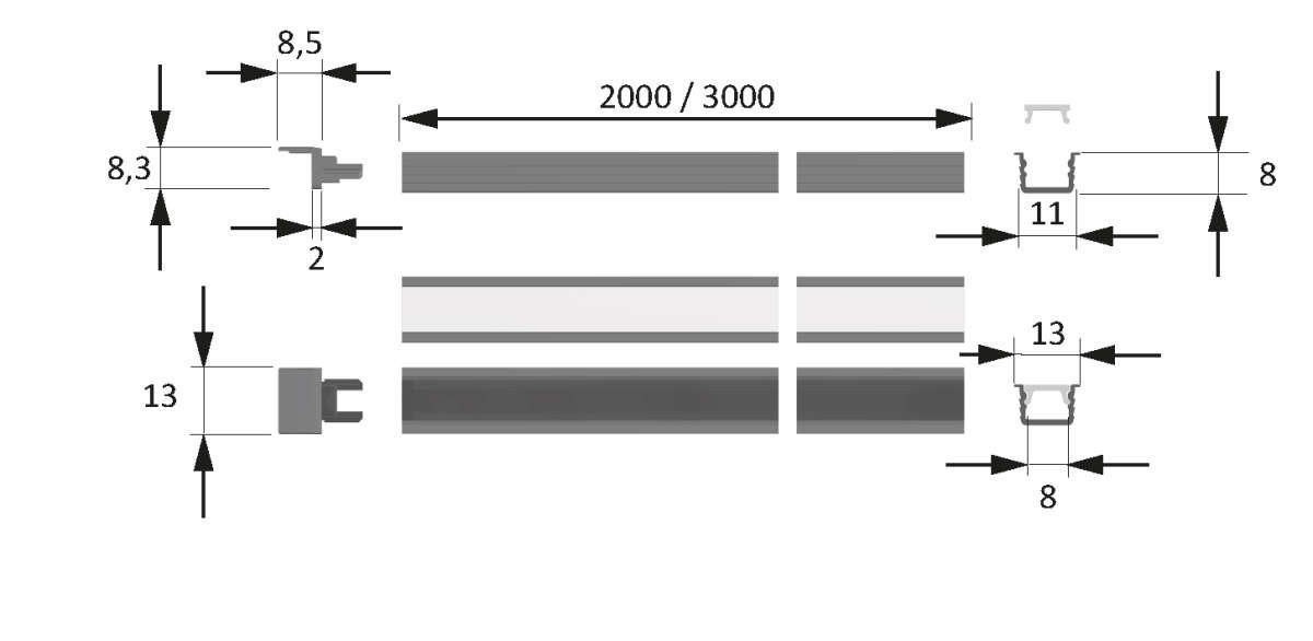 LED ChannelLine i2 Profil, opal L=3000, Alu-und Abdeckprofil