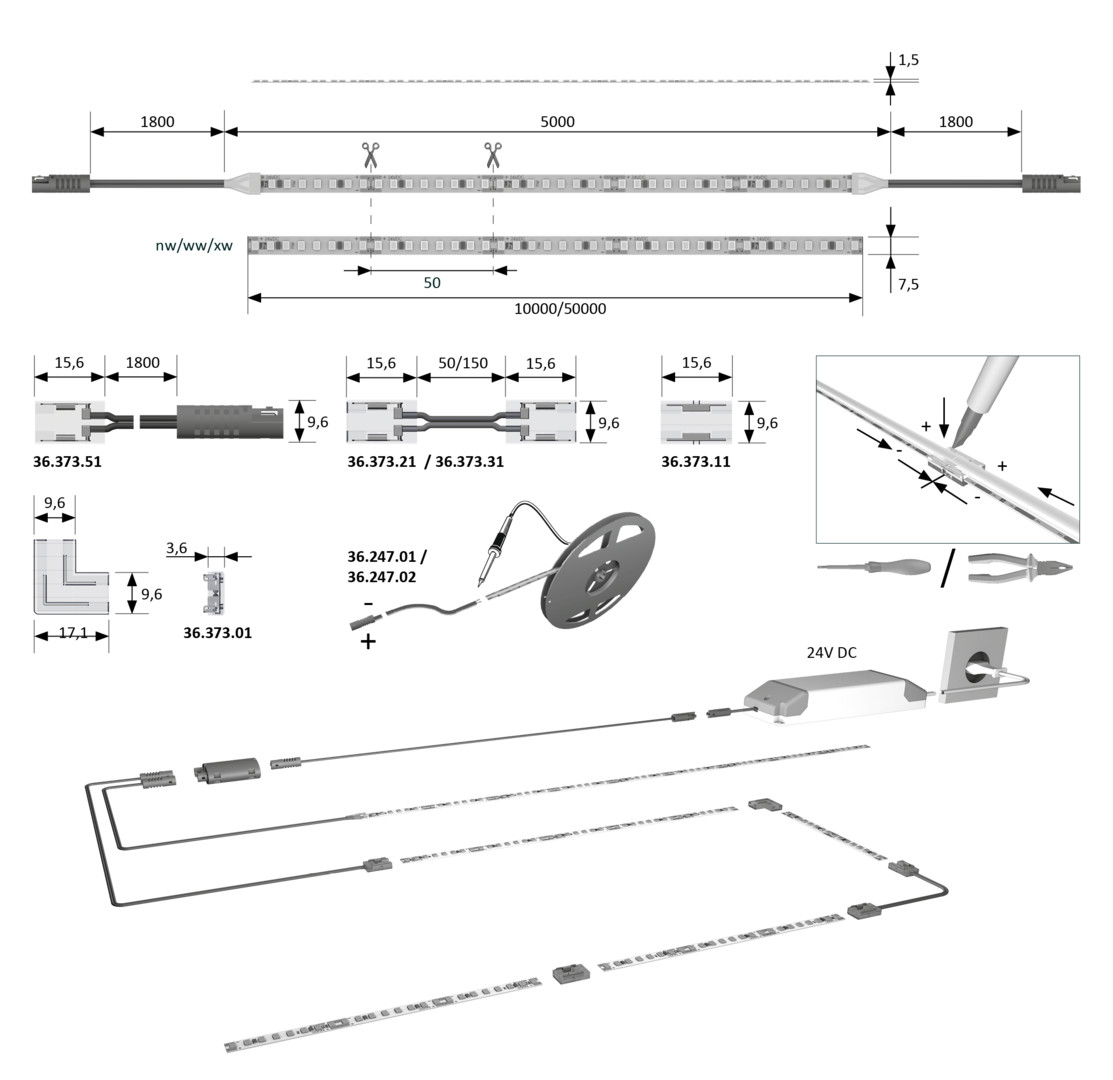 - Beidseitige Zuleitung bei der 5000 mm Länge (ein Schnitt, zwei Leuchten), siehe Zeichnung