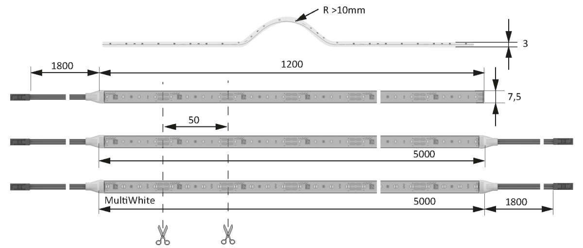 - Beidseitige Zuleitung bei der 5000 mm Länge(ein Schnitt, zwei Leuchten), siehe Zeichnung