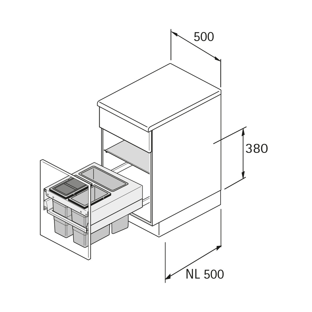 • Oben laufendes Abfallsystem für ArciTech Frontauszüge, Systemhöhe 186 mm, Zargenhöhe 94 mm, Nennlänge (NL) 400 oder 500 mm