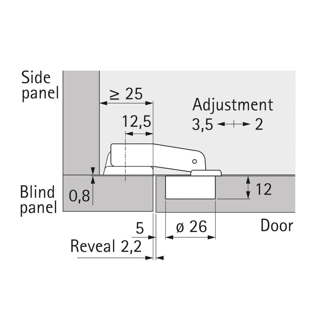 - Automatikscharnier mit Aufschiebetechnik und kurzem Seitenteil