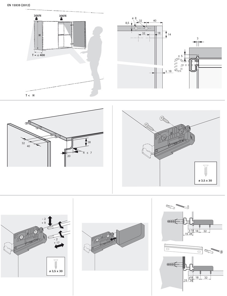 - 3-dimensionale Ausrichtung: Höhe -2/+9 mm , Tiefe -2/+18 mm , seitlich bei Hakenaufhängung ± 6 mm / seitlich bei Schienenaufhängung ± 7 mm
