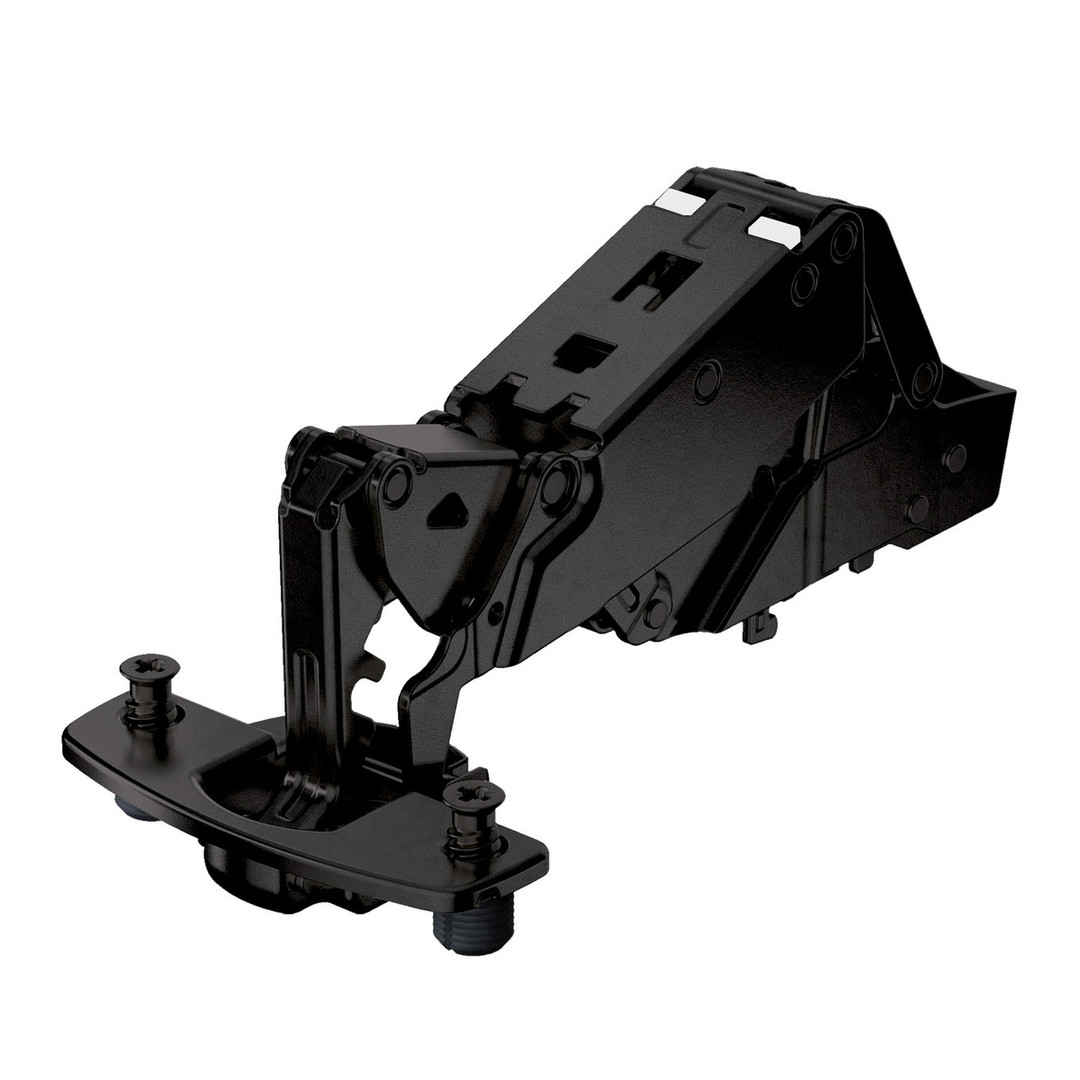 Hettich Sensys Weitwinkelscharnier, mit Null-Einsprung, ohne Schließautomatik (Sensys 8687), in obsidianschwarz, halb vorliegend, Öffnungswinkel 165°, TH-Bohrbild 52 x 5,5 mm, mit Spreizmuffen (ø 10 x 11)