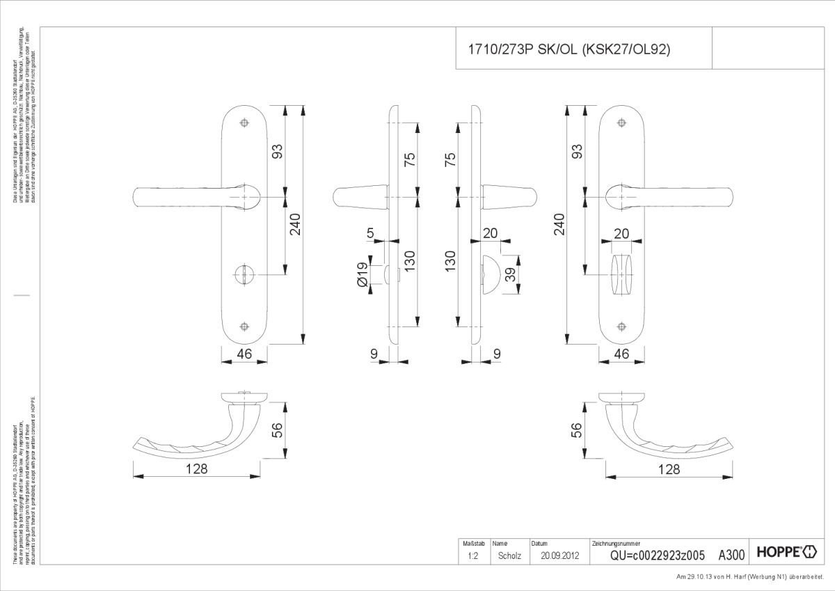 HOPPE-Aluminium-Langschild-Türgriff-Garnitur mit Schlitzkopf/Olive für Bad/WC-Türen