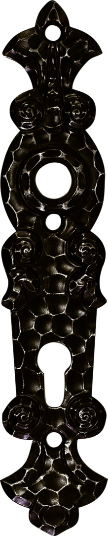 EI ROWE = RO st- und WE ttergeschützt, gehämmert, verzinkt, schwarz- und klarlackiert, eingebrannt, mit gehärteter Stahlplatte, Schildmaß: 282 x 62 mm (Si-208 H: 277 x 55 mm), Entfernung 92 mm, PZ-Lochung, Knopf-Ø 57 mm, ohne Drücker.