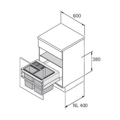 - Oben laufendes Abfallsystem für ArciTech Frontauszüge, Systemhöhe 186 mm, Zargenhöhe 94 mm, Nennlänge (NL) 400 oder 500 mm