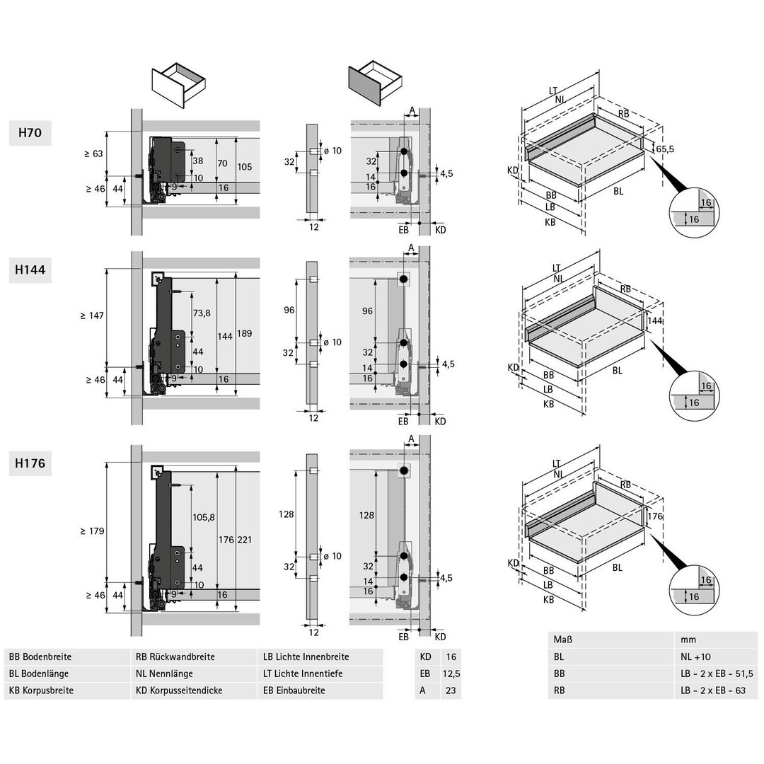 | Ausführung | Hettich Quadro Compact mit Silent System, 470 mm |