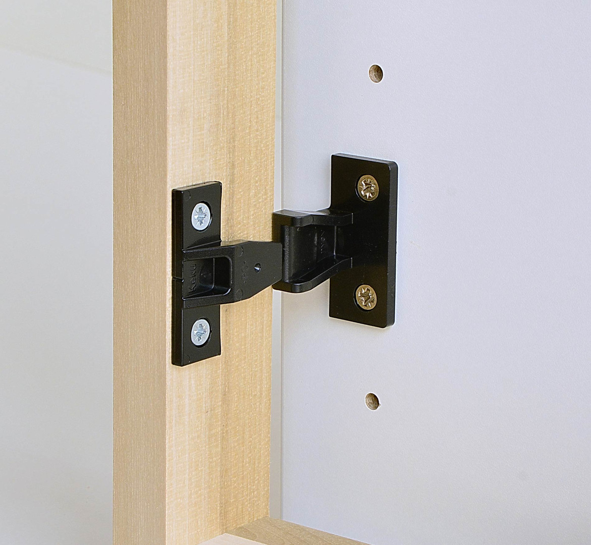 Die Keku® Aufschiebebeschläge sind zum Befestigen von Paneelen an Rahmenkonstruktionen und Korpusseiten entwickelt worden. Sie sind vor allem im Möbelbau verbreitet. Front-, Seiten- und Sockelblenden lassen sich mit diesen Beschlägen leicht und sicher von vorne aufschieben. Da kein Höhenhub notwendig ist, sind sie für Revisionsblenden prädestiniert.