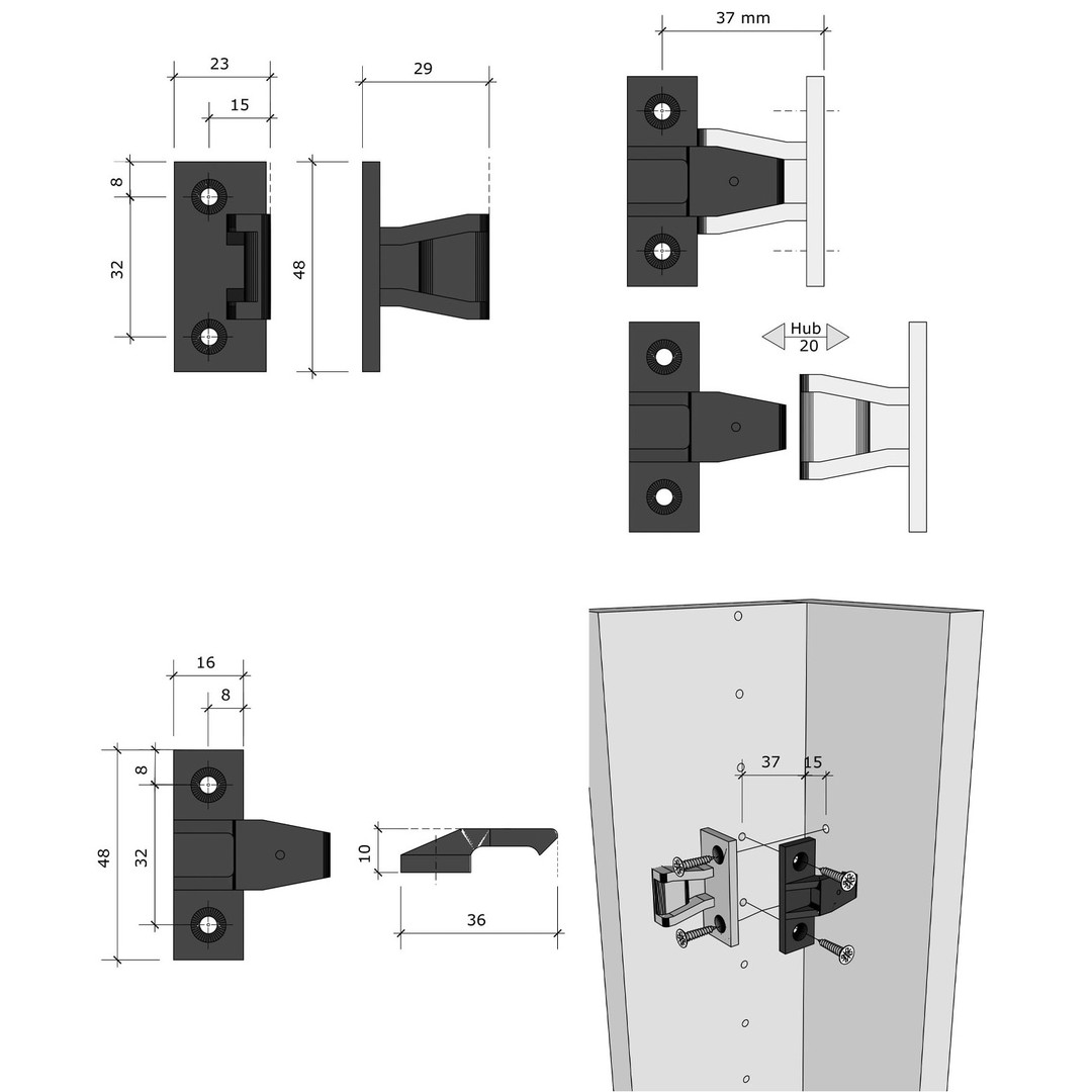 AS Beschläge bestehen aus dem Plattenteil AS und dem Rahmenteil AS bzw. aus der Kombination des Plattenteils AS mit dem Rahmenteil ASR. Beide Teile lassen sich mit Spanplattenschrauben 4 mm oder Euro-Schrauben 3 und 5 mm auf die Paneele bzw. die Rahmenkonstruktion anschrauben und können dann (reversibel) zusammengefügt werden. Ergänzend kann die Distanzplatte AS eingesetzt werden, um die Flächenbündigkeit zu angrenzenden Türfronten herzustellen. Sie ist stapelbar und selbstfixierend.