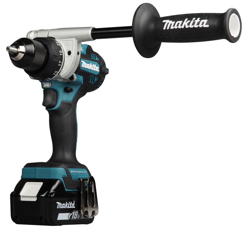 Kraftvoller, sehr kurzer 18V Akku-Bohrschrauber mit einem 2-Gang-Vollmetall-Planetengetriebe und einem bürstenlosen Motor. Mit Metall-Bohrfutter und Seitengriff. Eine ideale Wahl für Anwendungen, welche ein hohes Drehmoment erfordern. Inkl. leuchtstarker Doppel-LED mit Vor- und Nachglimmfunktion.