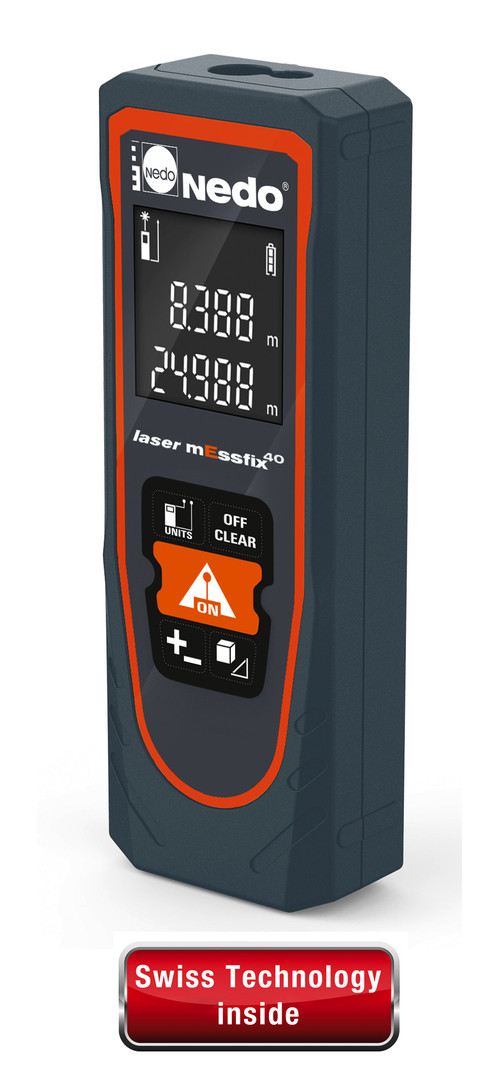 Mit einem Messbereich bis 40 m und einer Messgenauigkeit von ± 3,0 mm ist der laser mEssfix 40 der Laser-Entfernungsmesser für echte Profis. Extrem klein, handlich und äußerst robust. Messungen sind ab Gerätevorderkante oder ab der Gerätehinterkante möglich. Zahlreiche Messfunktionen helfen dabei, beim Aufmaß Zeit zu sparen.