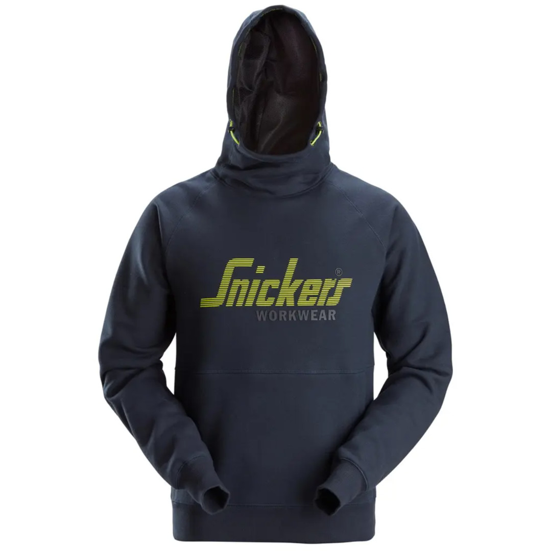 Klassischer Hoodie mit Snickers Workwear-Aufdruck und angenehm hohem Kragen. Kängurutaschen mit Netzfutter.