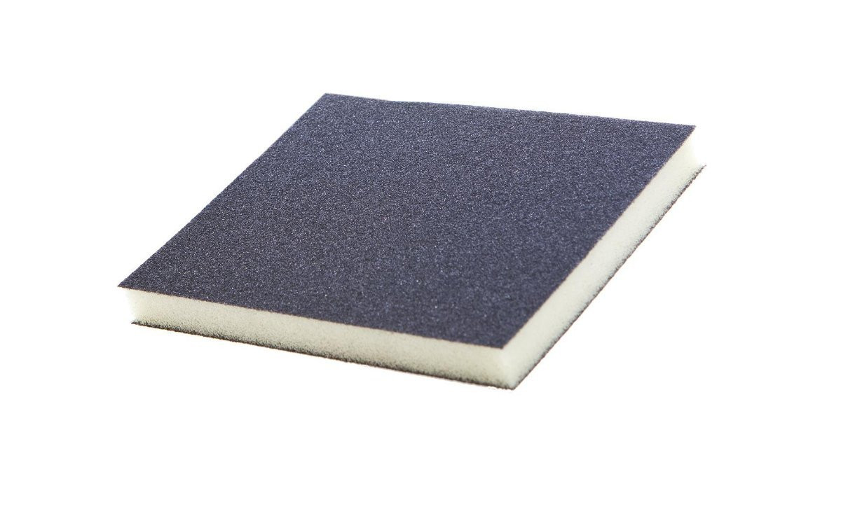 Siliciumcarbid-Schleifmittel zweiseitig auf Schaumstoffunterlage für Holzschliff, Lackzwischenschliff, Kunststoffschliff. Schaumstoff, weich.