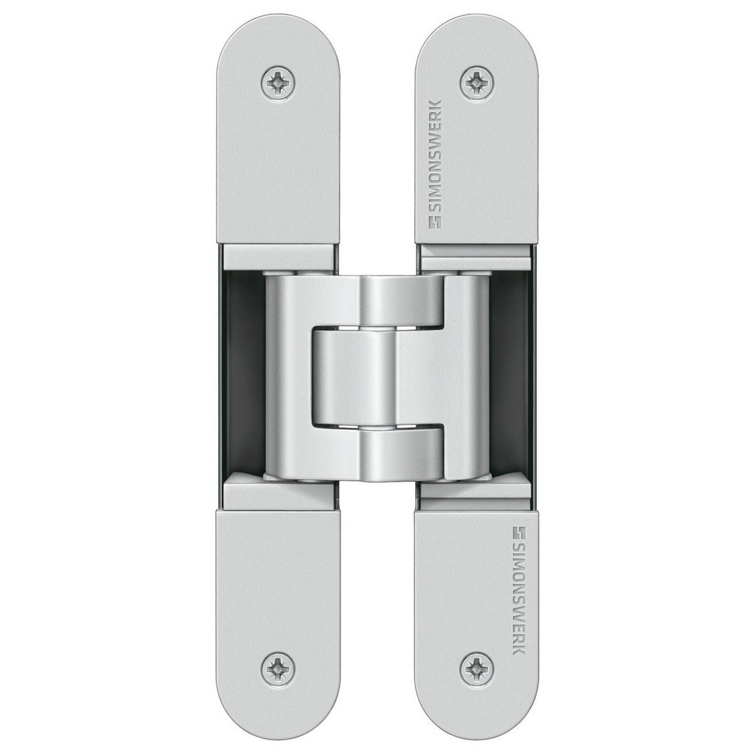 SIMONSWERK Türband TECTUS TE 340 3D. Komplett verdeckt liegend für ungefälzte Türen an Holz-, Stahl- und Aluminiumzargen. UL-zertifiziert, mit komfortabler 3D-Verstellung, Belastungswert 80 kg, Öffnungswinkel bis 180°, Gesamtlänge 160 mm, DIN rechts und links verwendbar, wartungsfreie Gleitlagertechnik, dreidimensional verstellbar: Seite +/- 3,0 mm, Höhe+/- 3,0 mm, Andruck +/- 1,0 mm.