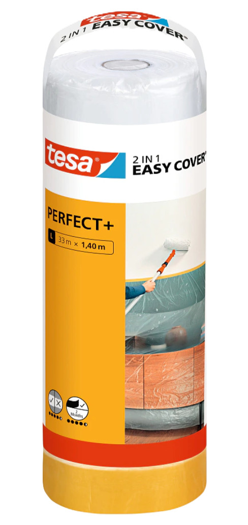 Mit dem 2-in-1-Produkt tesa® Easy Cover Perfect+ erzielen Sie überzeugende Ergebnisse. Die clevere Abdecklösung kombiniert eine sehr robuste Abdeckfolie und ein reißfestes Malerband in einem. Der echte Washi-Träger sorgt für sehr scharfe Farbkanten. In nur einem Arbeitsschritt schützen Sie Oberflächen und Gegenstände vor Schmutz, Staub, Farbspritzern, Farbunterläufern oder Putz.